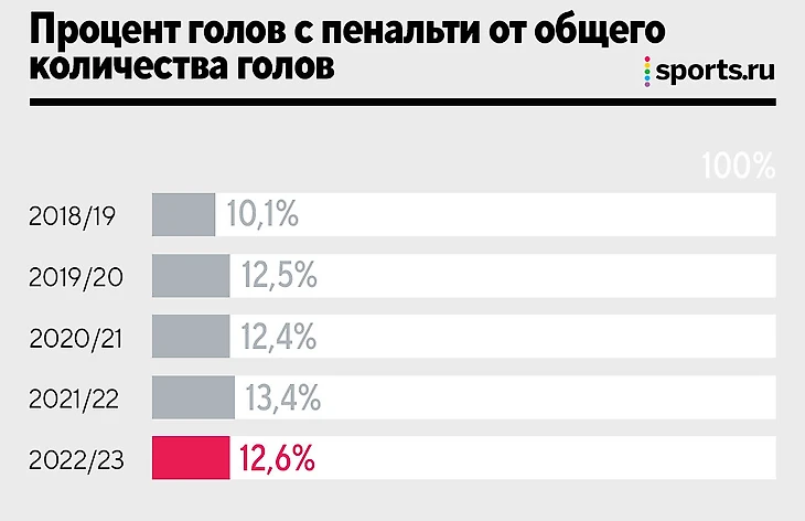 Количество пенальти за 90 минут после окончания сезона зависло на цифре 0,51, практически по удару на два матча. В прошлом и позапрошлом сезонах чуть меньше, в среднем 0,46.