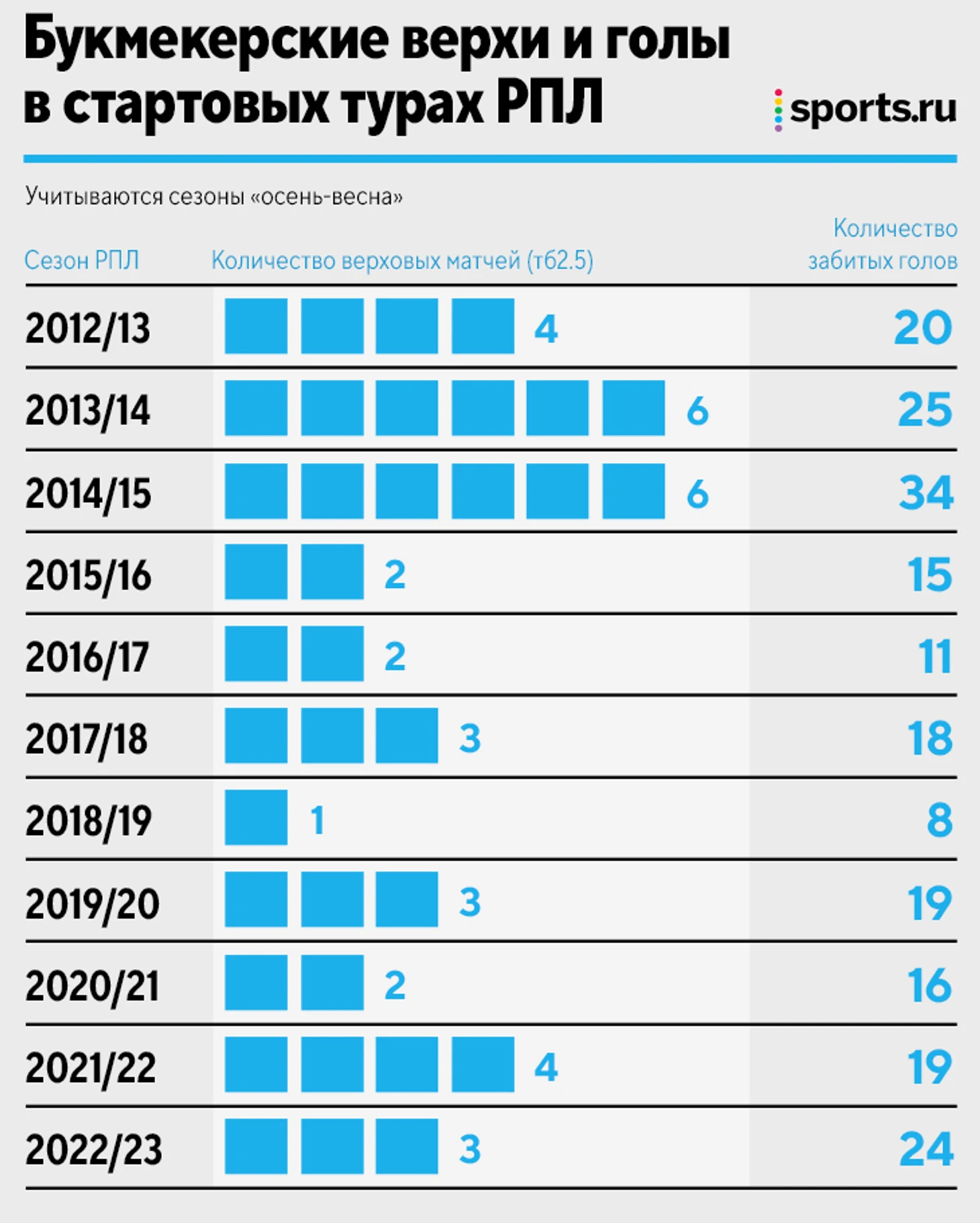 Сколько же верховых матчей было в первом туре каждого из сезонов и сколько мячей было забито всего? Смотрим, начиная с РПЛ-2012/13, первой по новой схеме.