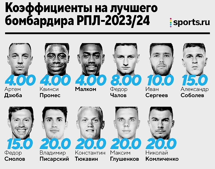 Кто станет лучшим бомбардиром РПЛ-2023/24? Букмекеры верят в Дзюбу, Промеса и Малкома, но фавориты побеждают не всегда