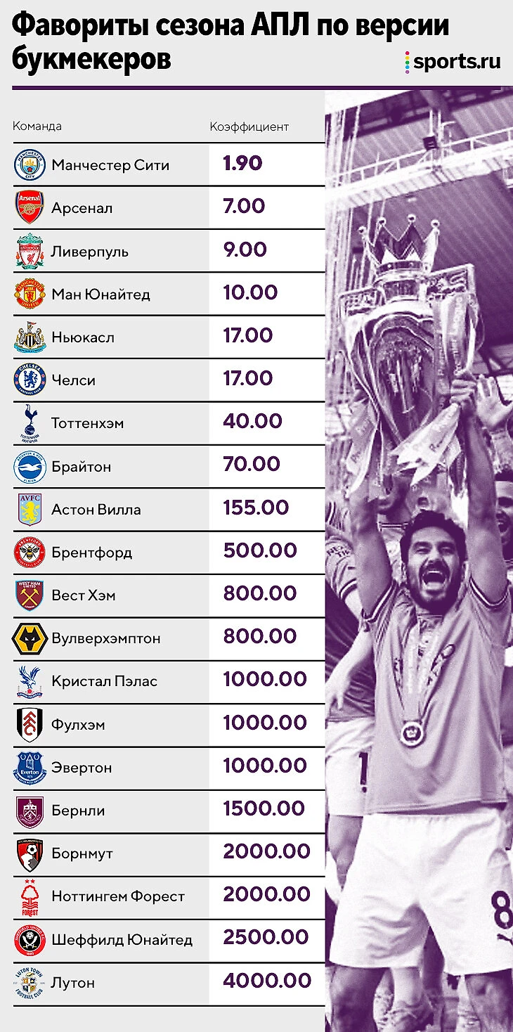 «Арсенал» и «Ливерпуль» – следующие претенденты, коэффициенты на их чемпионство – 7.00 и 9.00. Шансы «Манчестер Юнайтед» оценивают в 10.00, «Челси» и «Ньюкасла» – в 17.00. Вариант с успехом «Тоттенхэма» котируется за 40.00, а «Брайтона» – за 70.00. «Астон Вилла» (155.00) или «Брентфорд» (500.00), «Вест Хэм» и «Вулверхэмптон» (по 800.00) тут для разнообразия.
