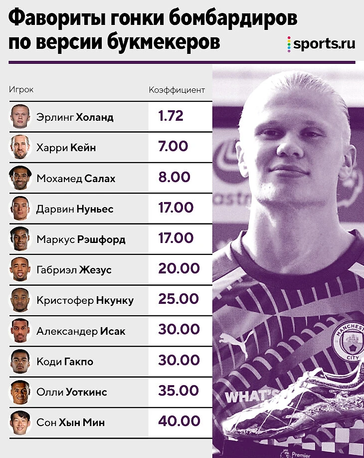 • А кто станет лучшим бомбардиром? Конечно же, фаворит – Эрлинг Холланд, коэффициент на него – 1.72. Все остальные заметно дальше – за 7.00 предлагается Харри Кейн (который пока не уехал в «Баварию»), за 8.00 – Мохамед Салах. Есть и еще несколько претендентов – Дарвин Нуньес или Маркус Рэшфорд (за 17.00), Габриэл Жезус (за 20.00) или даже Кристофер Нкунку (25.00).