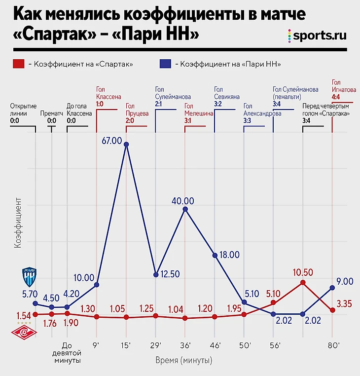 «Спартак» не был фаворитом всего 25 минут. Остальное время – даже при ничейном счете – коэффициент оставался ниже, чем на «Пари НН».