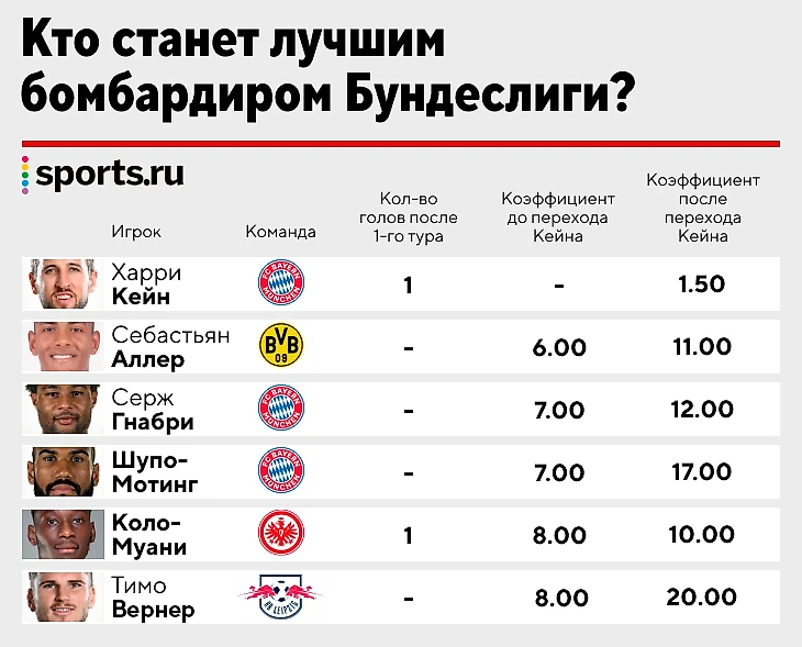 В Бундеслиге уже сыгран первый тур и многие считают, что никаких интриг в чемпионате, где играет «Бавария». Раздел «Ставки» на Sports.ru предложил свои варианты на команды, которые могут залететь в топ-4. Теперь – кто сможет помешать Харри Кейну забрать «Золотую бутсу» чемпионата.