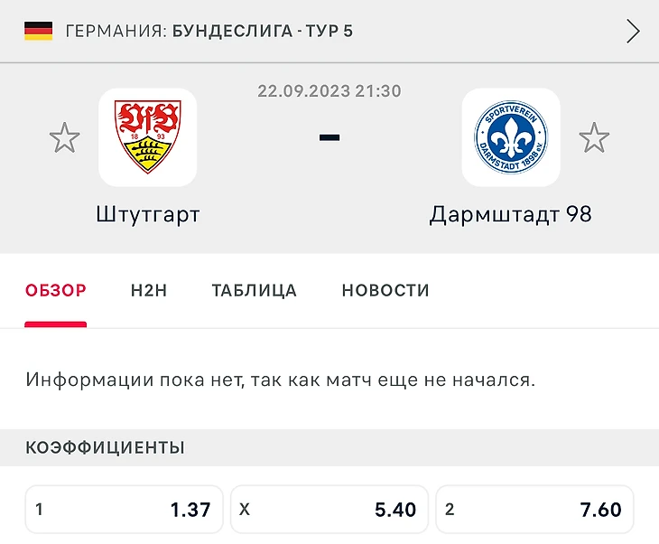 Прогноз на матч Штутгарт - Дармштадт 98 22 сентября 2023 года