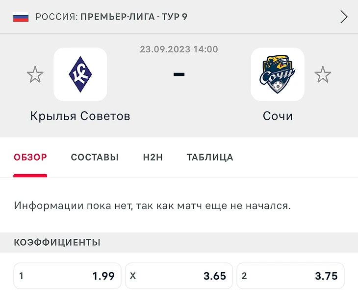 Прогноз на матч Крылья Советов - Сочи 23 сентября 2023 года