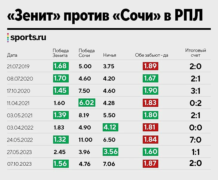 «Сочи» принимает «Зенит» в субботнем матче 16 тура РПЛ. Раздел «Ставки» на Sports.ru предлагает посмотреть на историю самого однозначного противостояния последних лет через букмекерские коэффициенты. К каким трендам и линиям выгодно присмотреться перед матчем? Поехали.