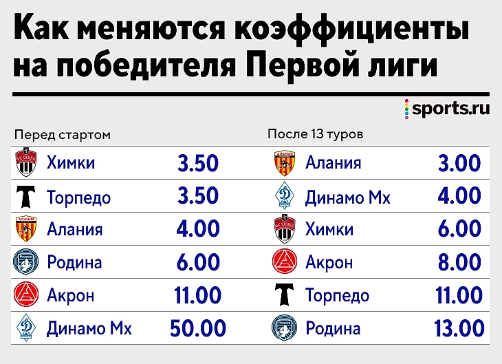 Что происходит в Первой лиге: коэффициент на «Динамо» с Бердыевым упал в 12 раз, «Торпедо» – больше не в четверке фаворитов