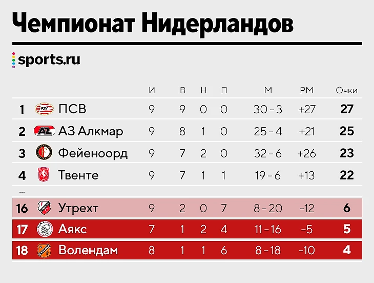 ● Меньше семи очков в шести турах – антирекорд клуба. Кстати, Opta провела анализ по ожидаемым очкам за все эти матчи – по ним «Аякс» вообще должен идти последним в таблице.