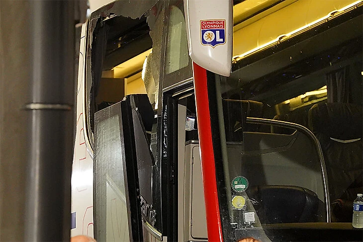 По данным RMC Sport, двумя камнями с брусчатки неизвестные разбили два окна в автобусе. Гроссо после этого пришлось накладывать швы. Пострадал также его помощник. Как сообщает L’Équipe, помимо автобуса команды, также камнями закидали три автобуса с фанатами «Лиона». Болельщики получили легкие травмы, транспортные средства вышли из строя и не могут сразу вернуться в Лион. Решение о том когда проведут матч будет позже.