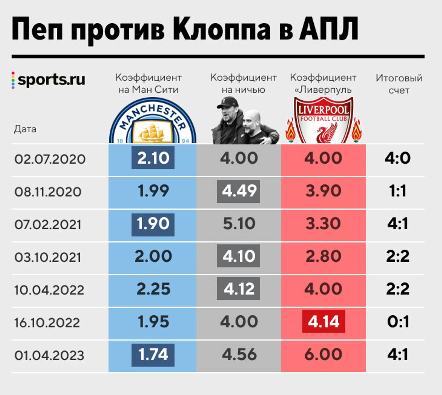 ● Кстати, начиная с прошлого года кэф на «Сити» ниже двойки – 1.95; 1.74 и 1.80 в грядущем матче.