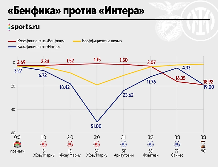 ● Наивысший коэффициент на ничью доходил до 19.00 (сразу после хет-трика Жоау Мариу), на победу «Интера» тоже – 51.00.
