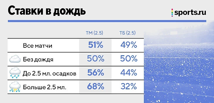 Существует исследование по ставкам на тотал во время дождя. Конечно – надо грузить на тотал меньше, вот статистика.