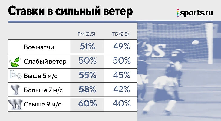 В ветер ситуация схожа: чем выше сила, тем выше тотал меньше.