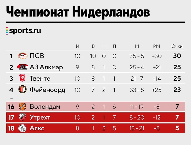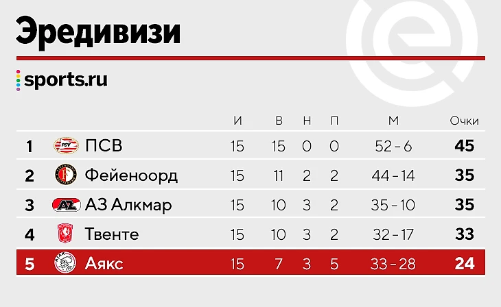 И вот итог: «Аякс» уже замыкает топ-5 в голландском чемпионате, а заодно попал в Лигу конференций.