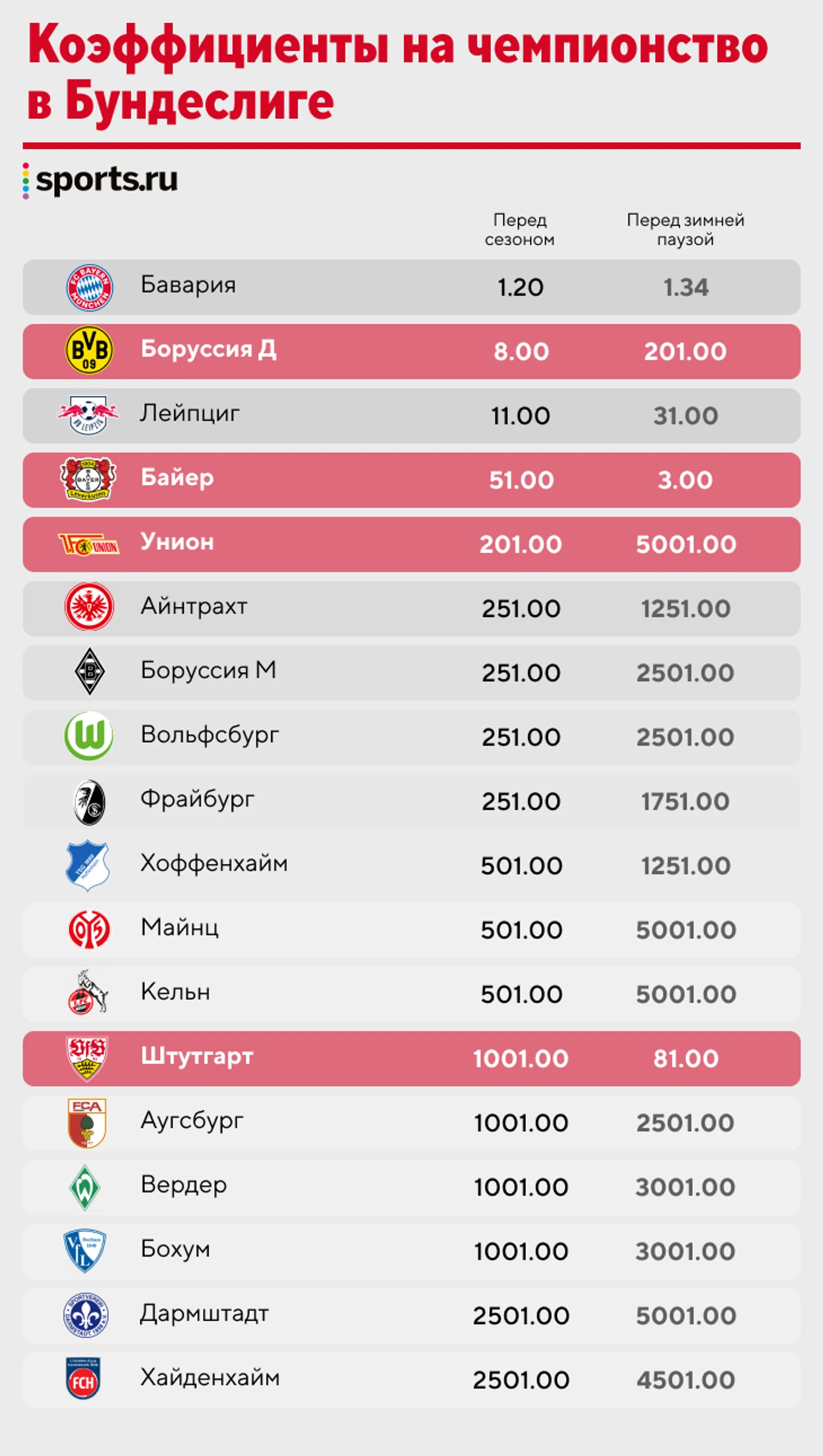 В таблице она отстает от «Байера» на четыре очка при игре в запасе. Падение коэффициента на клуб из Леверкузена произошло в 17 раз. А на «Штутгарт» – в 12 раз, он сейчас в четырех очках от «Баварии», но сыграл на матч больше.