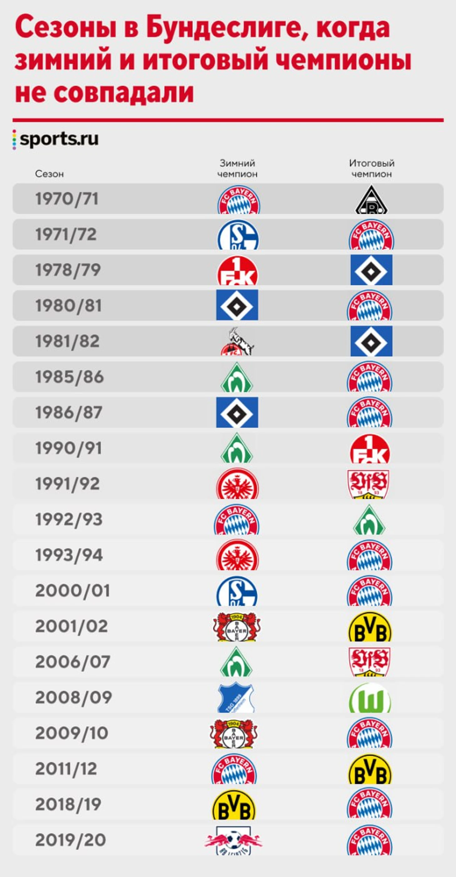 «Бавария» во второй колонке встречается чаще остальных – девять раз перехватывала титул, а отдавала только трижды. «Гамбург» и «Штутгарт» выигрывали по два чемпионства, не лидируя к зимней паузе. «Байер», который сейчас идет первым в Бундеслиге, дважды обижали раньше – в 2002-м и 2010-м.