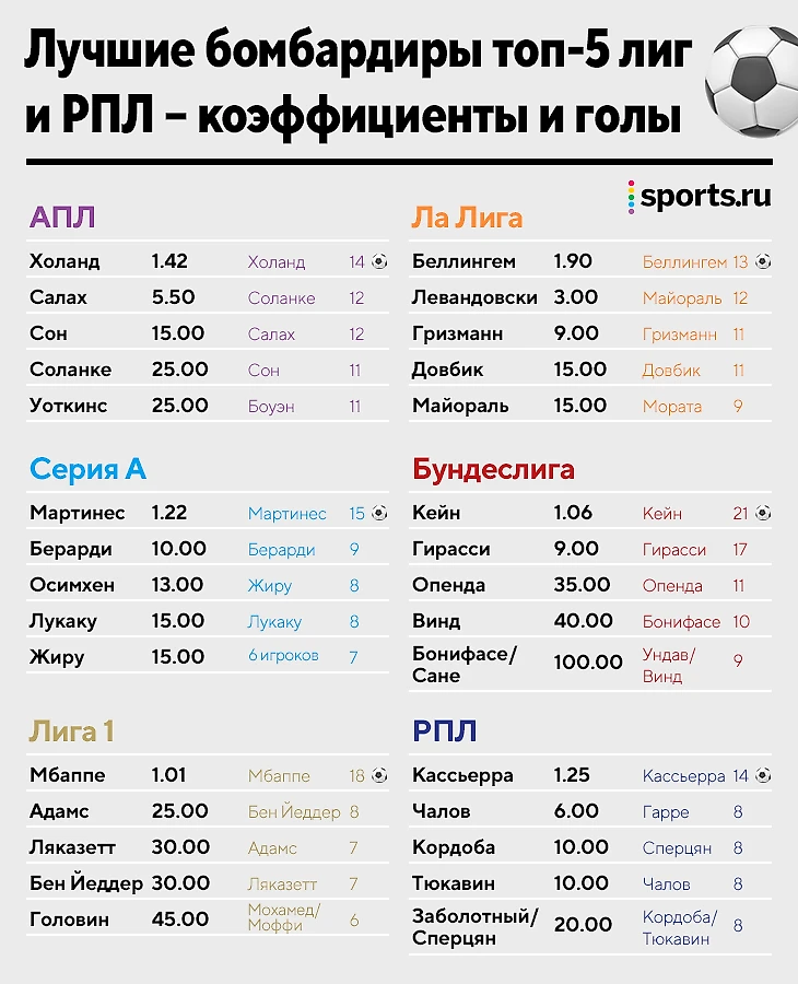На графике мы показали, что происходит в топ-5 лигах и РПЛ. Под каждым чемпионатом слева топ коэффициентов на лучшего бомбардира, справа – лучшие бомбардиры на данный момент.