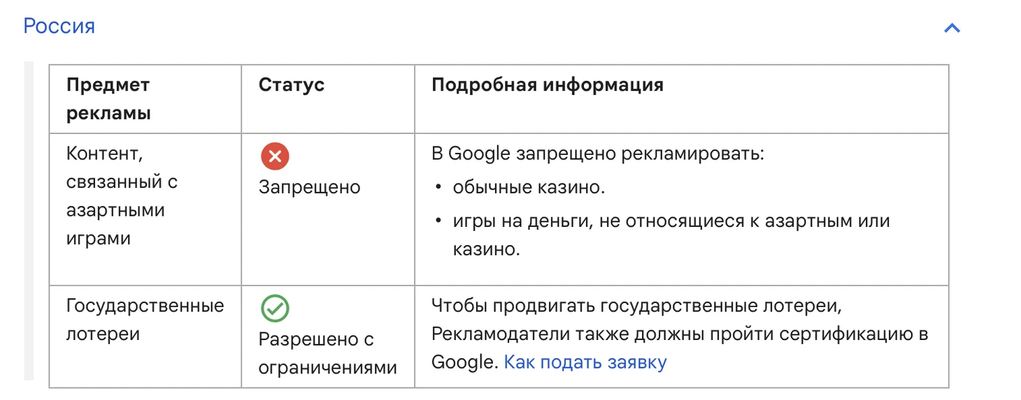 Так выглядит блок, посвященный России. По сути, разрешены только гослотереи – и то с предварительного одобрения каждой конкретной.