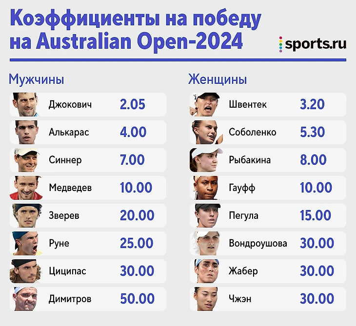 У мужчин победа Новака Джоковича на турнире оценивается в 2.05, Карлоса Алькараса – в 4.00, Янника Синнера – в 7.00, а Даниила Медведева – в 10.00. У женщин также есть своя топ-четверка с коэффициентом до десятки включительно – 3.20 на Игу Швентек, 5.30 – на Арину Соболенко, 8.00 – на Елену Рыбакину, 10.00 – на Кори Гауфф.