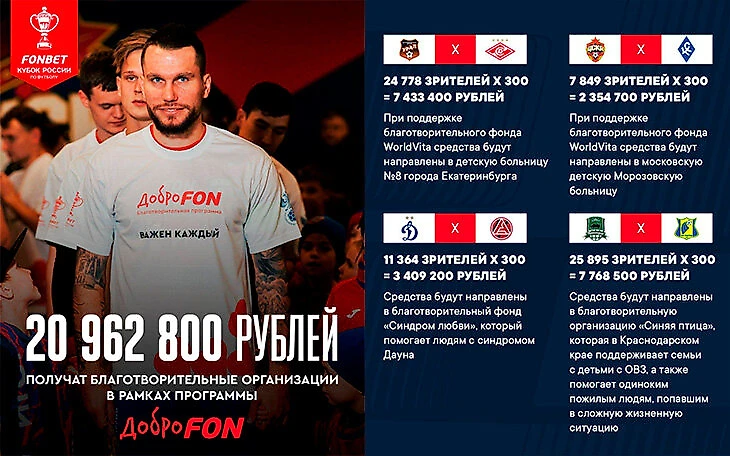 Плюс благотворительность – широкая поддержка в регионах. У нас была программа «Доброфон» – мы умножали количество зрителей на 300 и выплачивали местным благотворительным организациям эту сумму. В прошлом сезоне благодаря этому направили почти 60 млн рублей на добрые дела: для городской больницы в Краснодаре, в Екатеринбурге получить почти девять миллионов рублей на закупку оборудования – серьезная поддержка. Так много не передавал ни один бренд за последние много лет, в прошлом сезоне это рекорд.