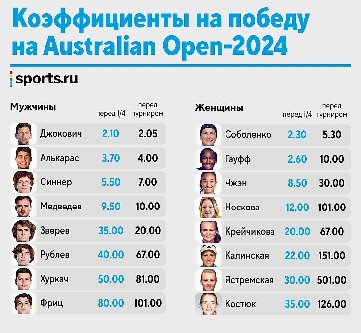 ● Остается та же пятерка главных фаворитов, их коэффициенты по понятным причинам ближе к титулу немного изменились. Но троица Рублев-Хуркач-Фриц не входила в число топ-8 претендентов.