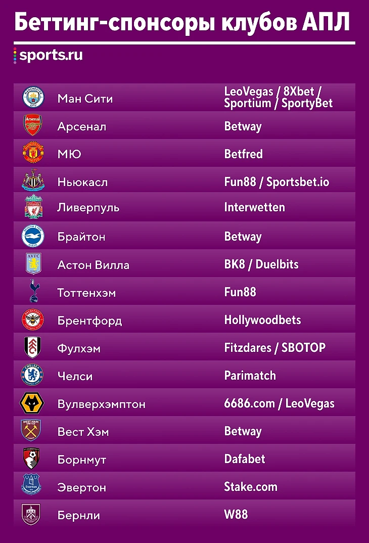 Впрочем, спонсоры-букмекеры есть почти у всех клубов АПЛ, просто это не титульное и не генеральное партнерство. Зачастую лого букмекеров даже не появляется на форме, а просто мелькает или на тренировочных комплектах, или даже просто на онлайн-площадках.