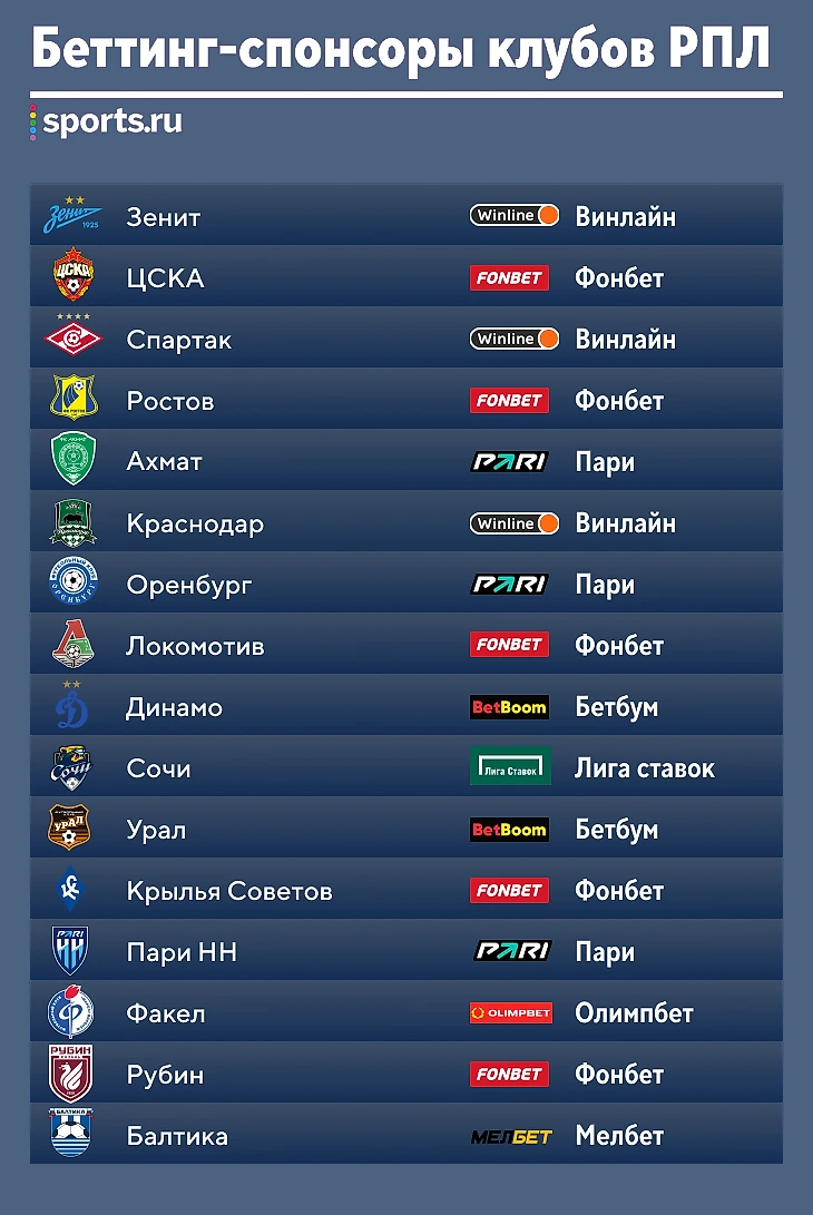 «Фонбет» забрал себе почти треть РПЛ, в сумме с «Винлайном» – покрытие половины клубов. Следом «Пари» с тремя партнерами.
