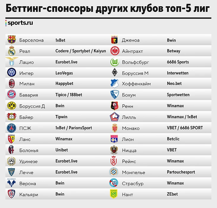 Многие клубы по всему миру пользуются выгодой от сотрудничества с букмекерами, хотя далеко не все об этом открыто заявляют. В России названия букмекерских компаний на экипировке у всех, но в топ-5 лигах так происходит не всегда.