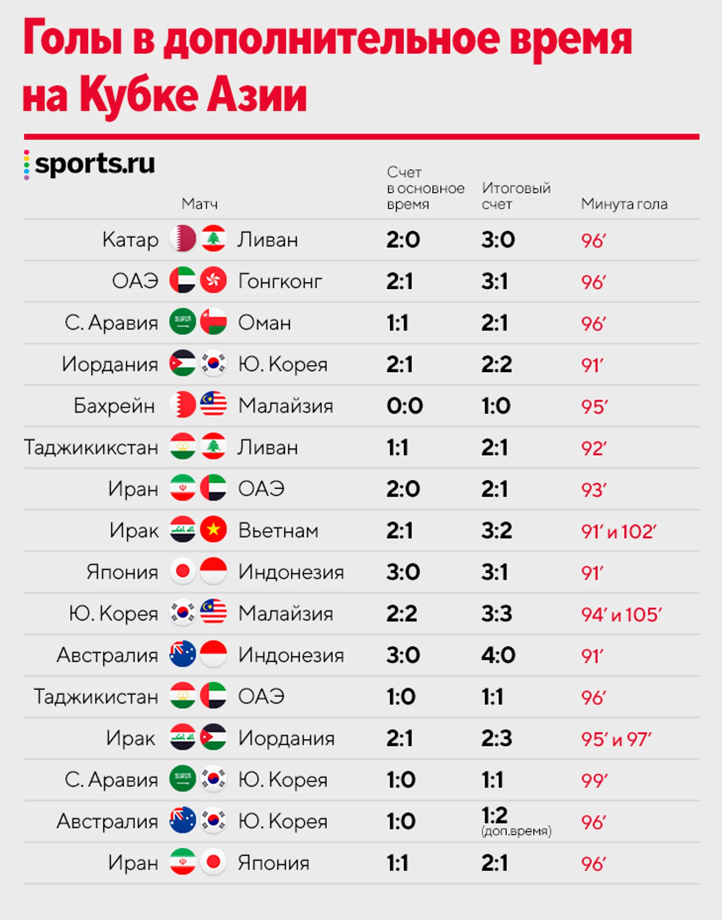 Из выживших в турнире команд у Кореи – четыре матча с голами на 90+ минуте, у Ирана – два, Катар и Иордания с одной такой игрой.