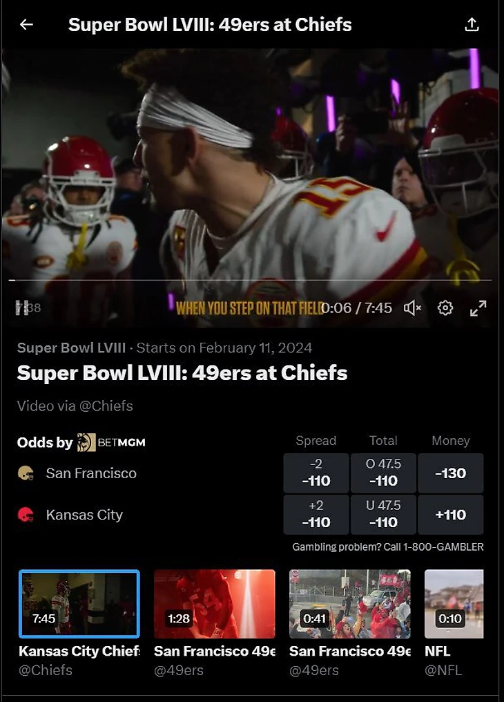 ● Пользователи X в Соединенных Штатах уже познакомились с нововведениями во время Супербоула. В планах – интеграция на других «крупных» видах спорта, включая NCAA. Исходя из пресс-релиза они «будут доступны в ближайшие недели». Пользователи смогут просмотреть коэффициенты на игру прямо в Твиттере/X и перейти на сайт или в приложение BetMGM, чтобы сделать ставку.