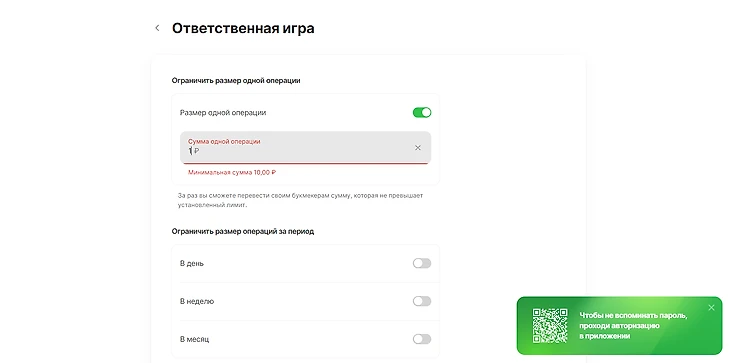 Можно выставить сумму одной ставки от 10 рублей, но никто не запретит сделать неограниченное количество таких единовременных ставок. Плюс существует опция по ограничению операций: день, неделя, месяц, на выбор.