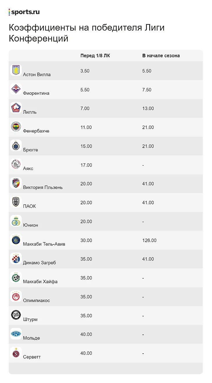 А кто станет победителем турнира? Здесь, как и в ЛЕ, наибольшие шансы у трех клубов из топ-лиг. «Вилла» – давний фаворит, как и «Фиорентина», а из команд с нетоповых чемпионатов подтянулся «Фенербахче».