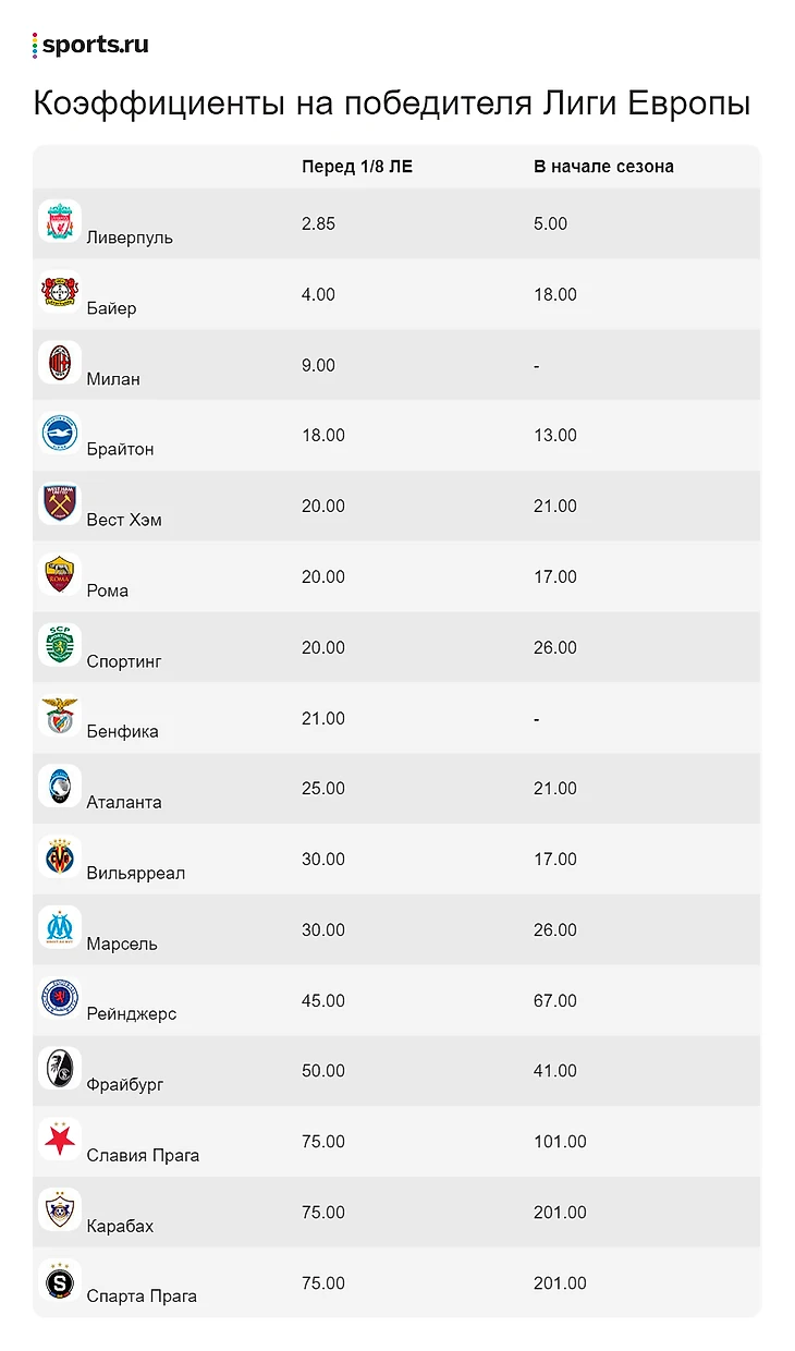 Котировки на возможных победителей ЛЕ также известны. Здесь в топ-3 представлены три разные лиги. А наименьшие шансы – у «Карабаха» и чехов.