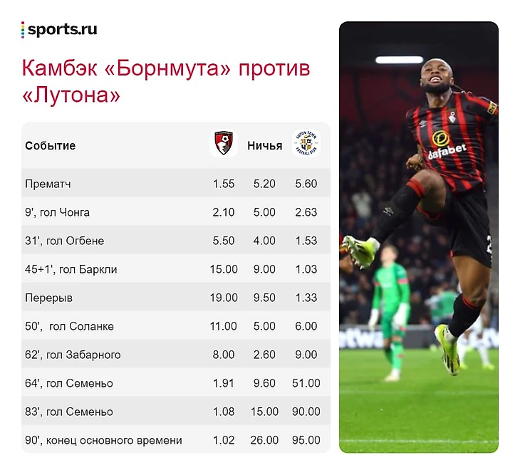 Вскоре украинец Илья Забарный после углового протолкнул мяч за линию – у судьи сработали часы автоопределения гола, 2:3. А уже на 64-й минуте Энтойн Семеньо неотразимо пробил в нижний угол из штрафной. «Борнмут» сделал 3:3 из 0:3 всего за 14 минут!