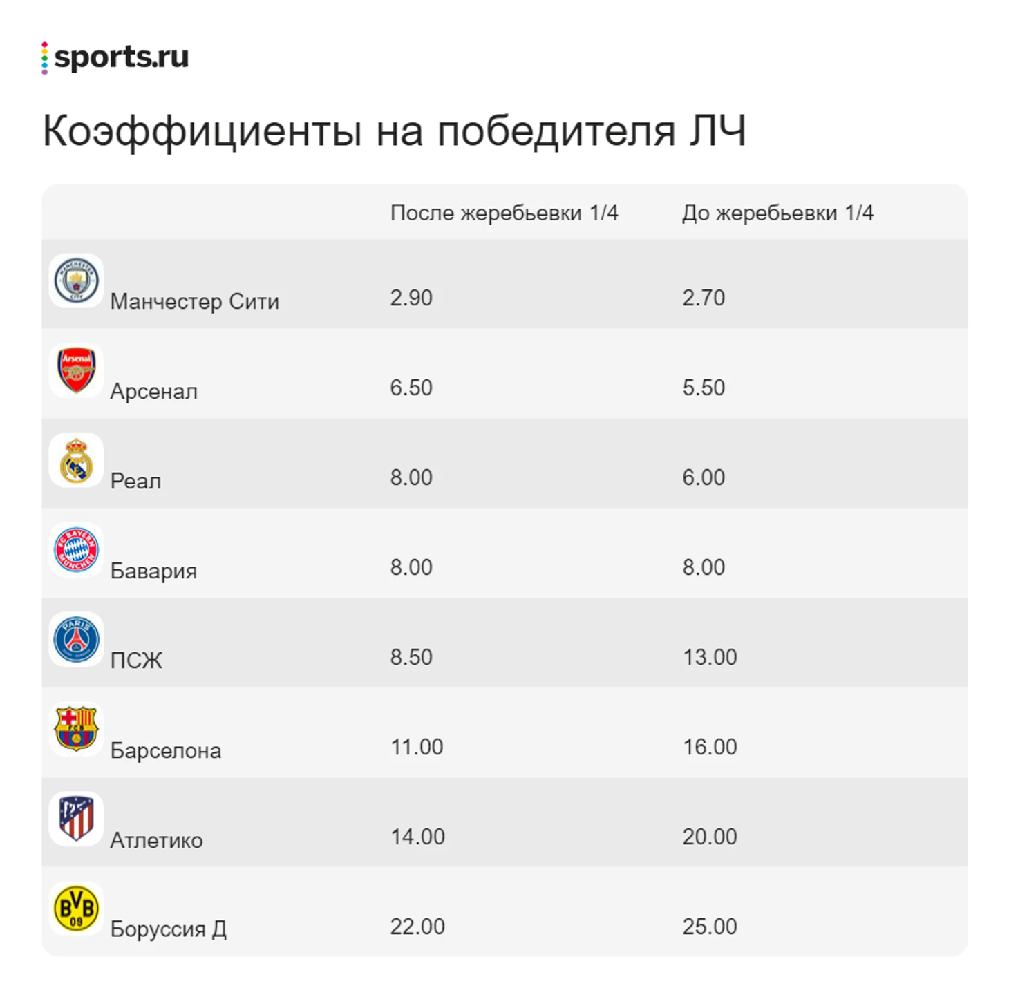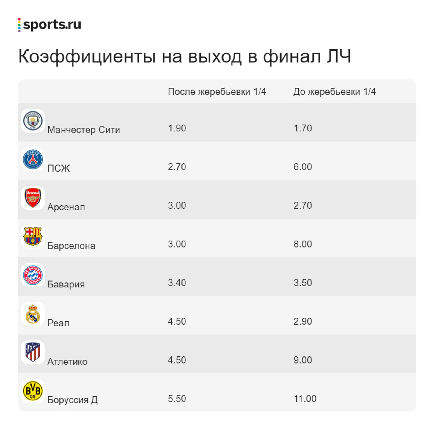 То есть полуфиналы по раскладам могут быть такими: «Арсенал» – «Ман Сити», «Атлетико» – «ПСЖ».