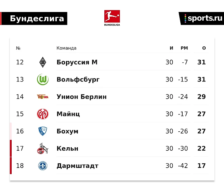 Среди пяти команд помимо «Кельна», рискующих попасть в стыки, попроще видится календарь у «Униона» – три соперника ниже 11-го места. У остальных – нет больших различий.