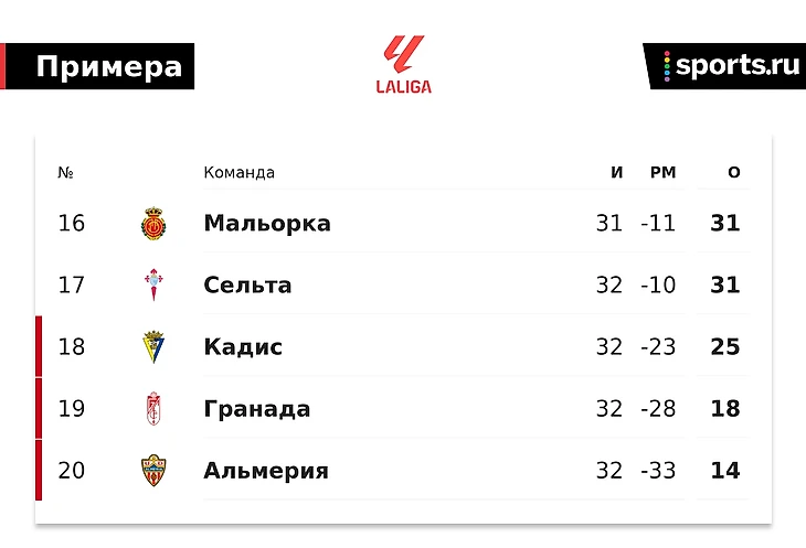 В Испании пока интриг видится меньше. «Альмерия» и «Гранада» вылетят в ближайших турах, так что останется только одно место для неудачников. И пока явный претендент на него – «Кадис».