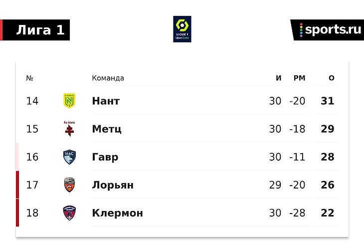 Календарь, кстати, у всех сложный. У «Метца» три соперника из первой семерки, у «Гавра» – из первой девятки, у «Нанта» – вообще трое из топ-4. «Лорьяну» тоже еще играть с «ПСЖ», «Лансом» и «Марселем».