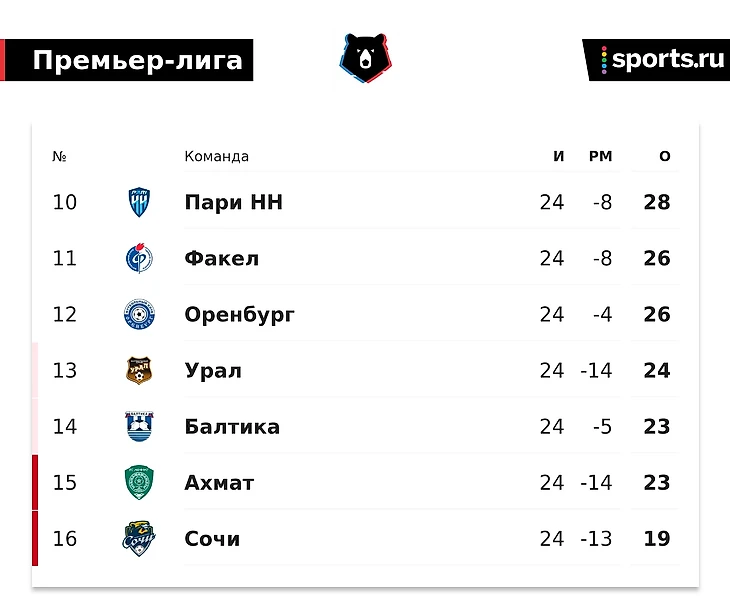 Вот такая ситуация в России: отстал, но пока не лишился шансов «Сочи», дальше сразу несколько команд в трех очках друг от друга, чуть больше запас у «Пари НН».