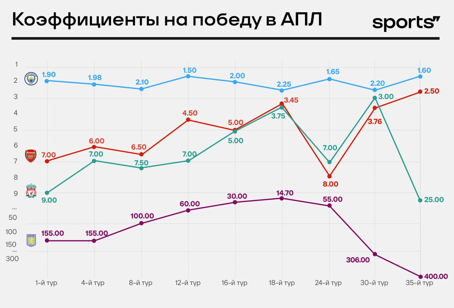 «Сити» стабильно провел весь сезон с точки зрения котировок. 2.25 в 18-м туре – самый валуйный коэффициент на победу команды Пепа. Сейчас 1.60.