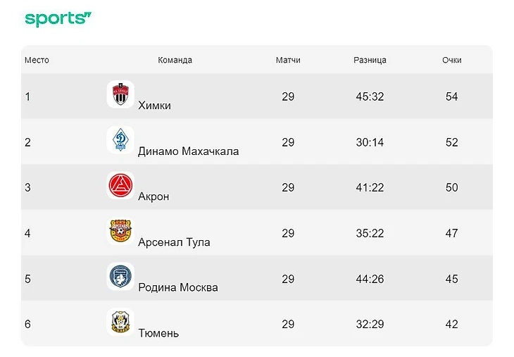 За повышение в классе напрямую борются «Химки», махачкалинское «Динамо» и «Акрон». «Арсенал» – на четвертой строчке, у него пока есть шансы попасть в стыки. Рядом – московская «Родина» с испанским тренером Франком Артигой и большими деньгами.