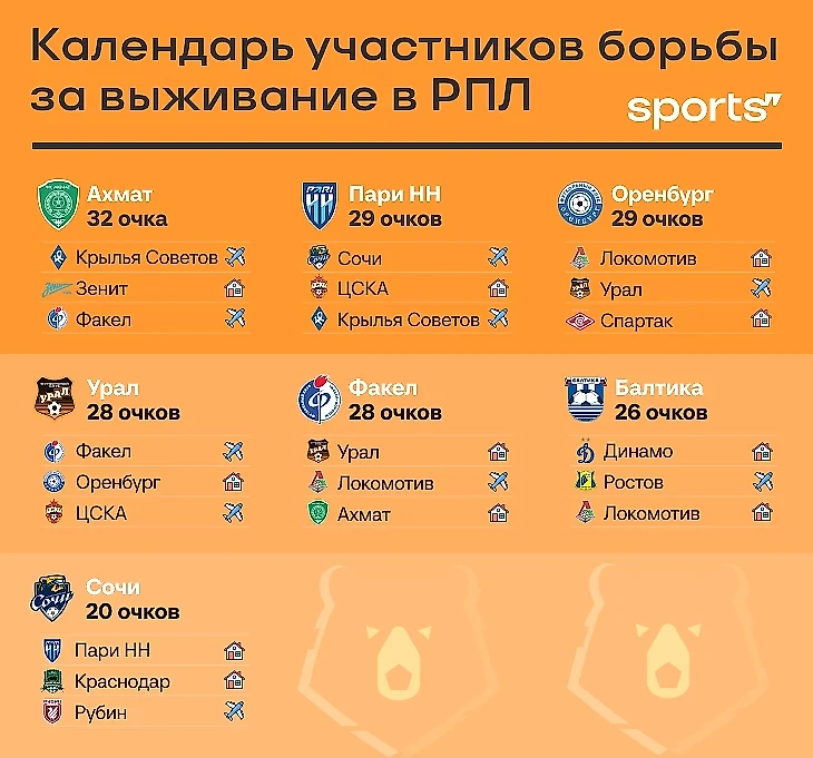 Перед стартом сезона считалось, что в РПЛ главных аутсайдеров будет три –«Факел», «Пари НН» и «Балтика», следующими по цифрам шли «Оренбург» и «Урал». Вся эта пятерка плюс «Ахмат» и «Сочи» бьется и сейчас. Уже на этой неделе – очередной этап борьбы.