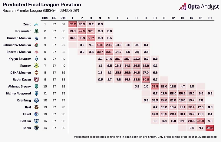 После 24 туров вылет «Балтики» оценивался в 47%, «Ахмата» – в 35%, «Урала» – 25%, «Оренбурга» и «Факела» – 5%, «Пари НН» – 3%.