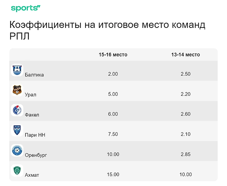 Перед зимней паузой на прямой вылет в РПЛ давали такие коэффициенты: «Балтика» – 1.55, «Сочи» – 1.65, «Оренбург» – 2.65, «Факел» – 5.50, «Ахмат» и «Урал» – по 7.00.
