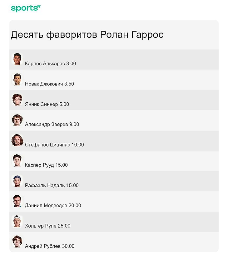 У букмекеров линии могут незначительно отличаться с четвертой позиции, но тройка фаворитов влинии Бетсити определена: Алькарас (3.00), Джокович (3.50) и Синнер (5.00). Стоят везде именно в таком порядке.