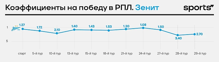 ● «Зенит» перестал считаться фаворитом только в 28-м туре. Здесь был максимальный коэффициент в 3.40. Любая осечка для действующего чемпиона становилась роковой. Две победы уже не гарантировали титул.