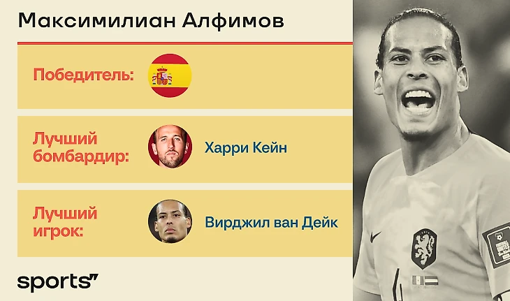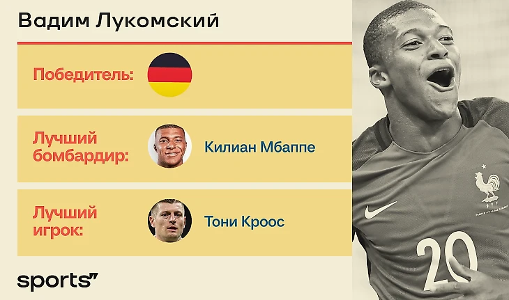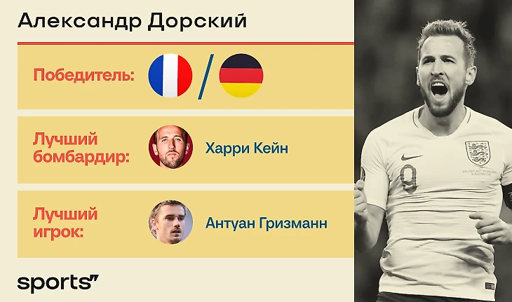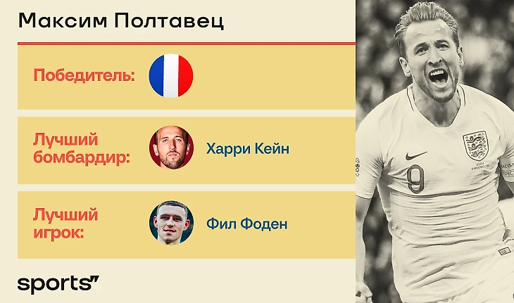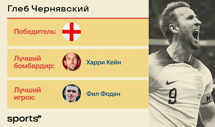 Победитель: сборная Англии. Мне странно, что кто-то допускает чемпионство Франции, Германии или еще кого-нибудь. По-моему, невозможно придумать состав сильнее, чем есть сейчас у Англии. Когда многие топы просто не попадают в заявку, а другие плотно сидят на бенче. Англия на этом Евро – что-то недостижимое. И пройдет турнир без поражений, а в финале спокойно заберет чашку после гола Кейна с пенальти.