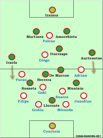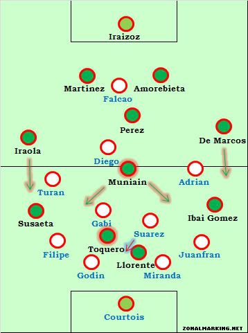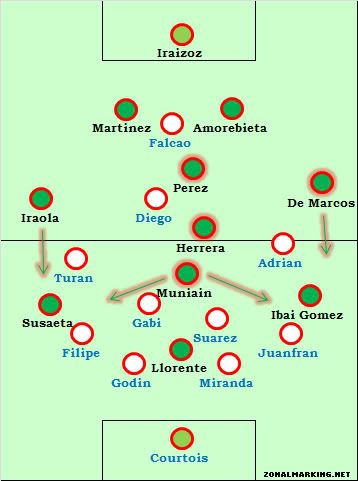 Атлетик нуждался в изменении своего игрового плана и несмотря на тот факт, что баски не вернуться к своему старому плану из-за пропущенного гола. Первая замена Бьелсы сработало действительно хорошо. Первая - классическая замена, вместо Итураспе (который не выполнил поставленную задача) появился Иниго Перес.