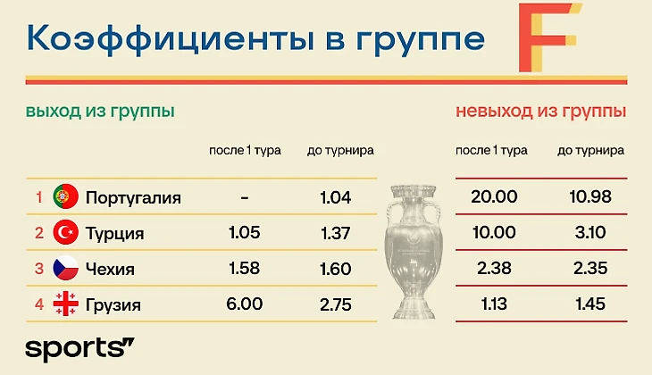 Наконец, группа F, в которой Турция обыграла 3:1 Грузию, а Португалия – 2:1 Чехию.