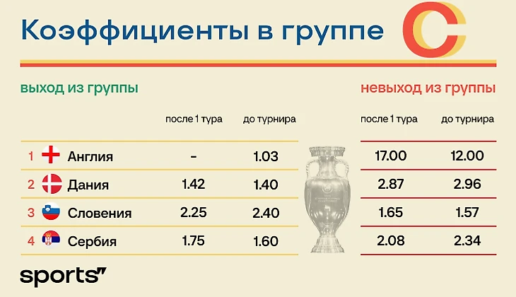 Следующая – группа С, в которой Англия выиграла 1:0 у Сербии, а Дания и Словения закончили 1:1.